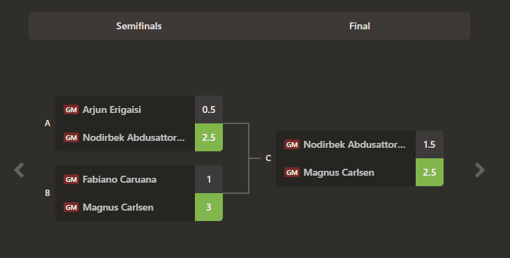 En una final de alto voltaje, Carlsen derrotó por 2.5–1.5 al uzbeko Nodirbek Abdusattorov; aunque, seis horas antes, parecía muy difícil que el noruego lograra incluirse ni siquiera entre los cuatro primeros puestos. Pero, Carlsen siendo Carlsen, tuvo un final espectacular (4 victorias y unas tablas) y, una vez en la semifinal, mostró su mejor nivel. Superó a Fabiano Caruana por 3-1, tras entablar los dos primeros duelos. Después comenzó detrás ante Abdu, al ceder en el primer cotejo; pero se repuso y, con negras, ganó la cuarta y última partida del match. Esta fue la quinta vez que logró el doblete rápido-blitz en una misma edición. A los 35 años, Carlsen sigue ampliando una vitrina que ya no admite comparaciones.
