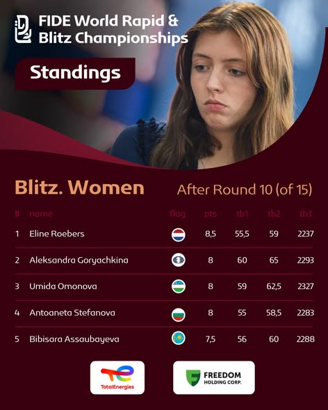 Aleksandra Goryachkina se mantiene al acecho con 8 puntos y confirma su excelente momento de forma, apenas horas después de conquistar el título mundial de ajedrez rápido. También con 8 puntos aparece la uzbeka Umida Omonova, una de las grandes revelaciones del día, tras derrotar a varias campeonas consagradas y confirmar que su rendimiento en torneos de ritmo rápido va en ascenso.