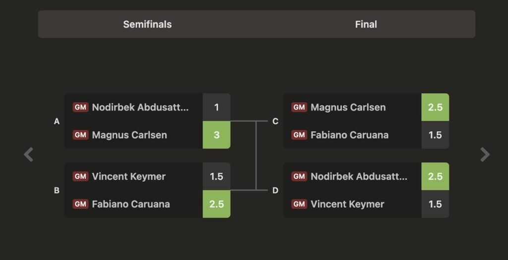 Esta vez no. Dominó la fase clasificatoria en el todos contra todos. Llegó a la final como favorito. Y allí lo esperaba un viejo conocido: Fabiano Caruana, su rival en el Mundial clásico de 2018.