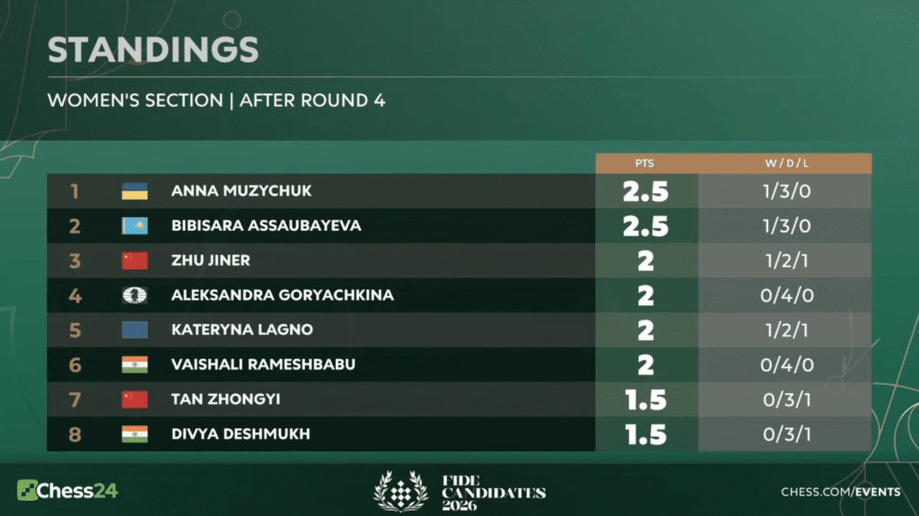 Tabla de posiciones del Torneo de Candidatas 2026. Foto: Chess.com