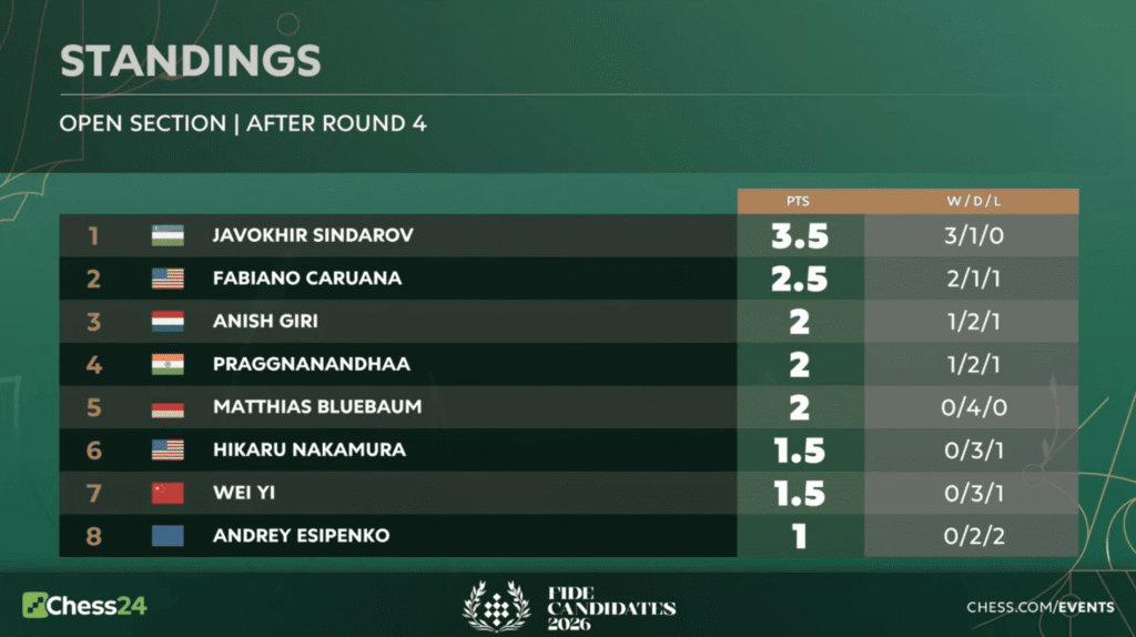 La cuarta ronda del Torneo de Candidatos 2026 dejó una imagen que altera por completo el equilibrio de la competición: Javokhir Sindarov, con apenas 20 años y en su primera participación en este escenario, derrotó a Fabiano Caruana en el duelo entre colíderes y se marchó al primer día de descanso como líder solitario con 3.5 puntos de 4 posibles.
