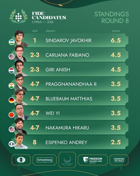 La octava ronda del Torneo de Candidatos 2026 movió por completo el tablero competitivo en Chipre. En el arranque de la segunda mitad, Hikaru Nakamura logró por fin su primera victoria del certamen al derrotar a Fabiano Caruana, mientras Anish Giri firmó un triunfo de gran calidad ante Praggnanandhaa para alcanzar precisamente a Caruana en la segunda posición. El gran beneficiado indirecto del día, sin embargo, volvió a ser Javokhir Sindarov, que sostuvo las tablas frente a Andrey Esipenko y amplió a dos puntos su ventaja cuando restan seis rondas por jugar.