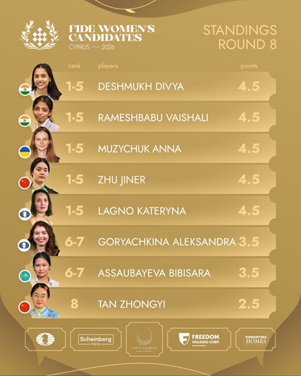 La octava ronda también sacudió el Torneo de Candidatas. La sorpresa mayor fue la victoria de Divya Deshmukh sobre Anna Muzychuk, en una partida en la que la india remontó una posición perdida, tras un burdo error de la ucraniana en el final (dejó un peón en el aire). Ese resultado abrió por completo la tabla femenina, donde cinco jugadoras quedaron igualadas con 4,5 puntos: Muzychuk, Zhu Jiner, Kateryna Lagno, Vaishali Rameshbabu y Divya. A diferencia del abierto, aquí la pelea por el liderato sigue completamente abierta.