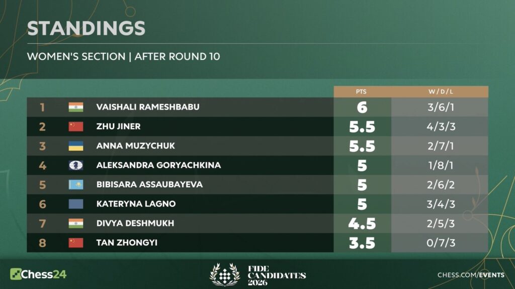La décima ronda del Torneo de Candidatas también movió la clasificación. Vaishali Rameshbabu hizo tablas con Anna Muzychuk y eso le bastó para quedar como líder solitaria, aprovechando la derrota de Zhu Jiner ante Bibisara Assaubayeva. El otro resultado decisivo fue la primera victoria de Aleksandra Goryachkina, que le infligió a Divya Deshmukh su segundo revés consecutivo. Con cuatro rondas por delante, el cuadro femenino sigue completamente abierto.