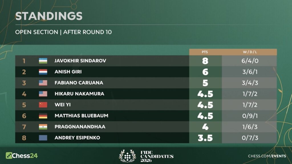 Con ese triunfo, Sindarov logró la mayor cantidad de victorias en el formato moderno del Candidatos, vigente desde 2013. Lo más llamativo del triunfo sobre Praggnanandhaa no fue solo el resultado, sino la manera. El uzbeco se lanzó con un sacrificio de pieza y entró en una lucha de alto voltaje, pese a que no necesitaba asumir tanto riesgo en términos de clasificación. Tras la partida, admitió que estaba “listo para una gran pelea” y hasta bromeó con que su equipo lo iba a odiar por una de sus decisiones en el medio juego, aunque enseguida matizó que la idea funcionaba bien. Si firma tablas en las cuatro partidas restantes, quedaría en camino de superar la histórica marca de Ian Nepomniachtchi de 9.5 puntos en 2022.