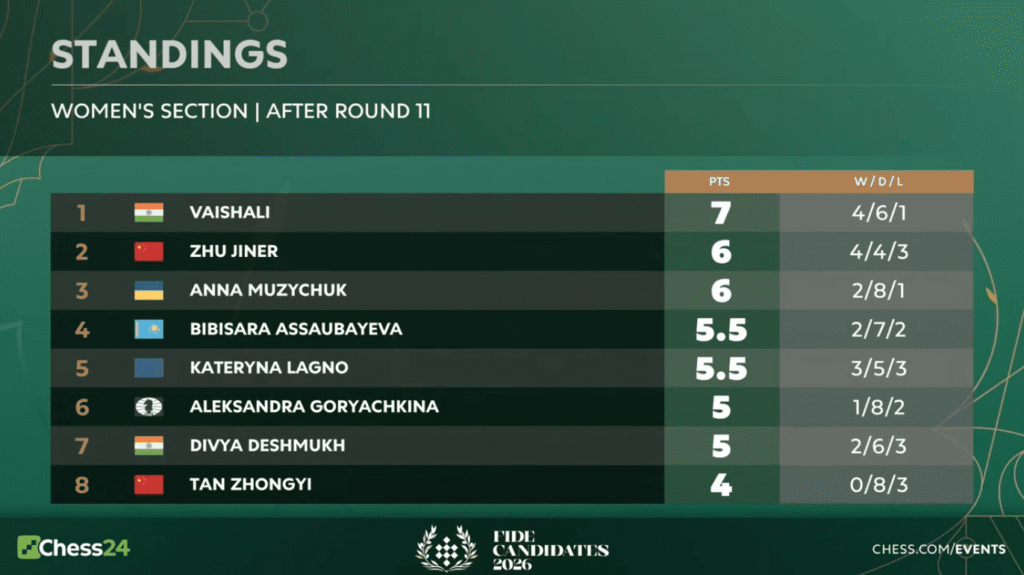 Mientras tanto, otras historias de la jornada reflejaron la tensión del torneo: Tan Zhongyi dejó escapar su mejor oportunidad de victoria en todo el evento tras una decisión apresurada en un final largo (102 jugadas), y Assaubayeva logró sobrevivir.