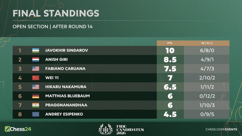 Sindarov llegó a la última ronda con el torneo ya decidido. Firmó tablas rápidas ante Wei Yi en apenas ocho minutos en una Española de los Cuatro Caballos, resultado suficiente para cerrar con 10 puntos de 14 posibles, la mejor marca en la historia del Candidatos. El récord anterior, 9.5/14, pertenecía a Ian Nepomniachtchi, en 2022.