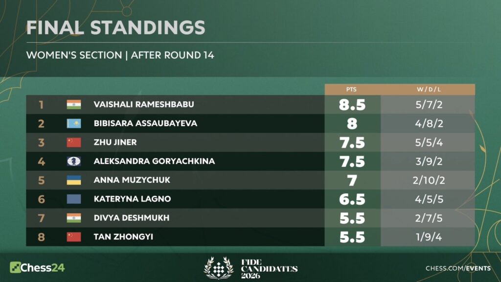 En el Torneo de Candidatas, el desenlace fue opuesto: todo se decidió en la jornada final. Seis jugadoras llegaron con opciones matemáticas, pero solo Vaishali y Bibisara Assaubayeva dependían de sí mismas.